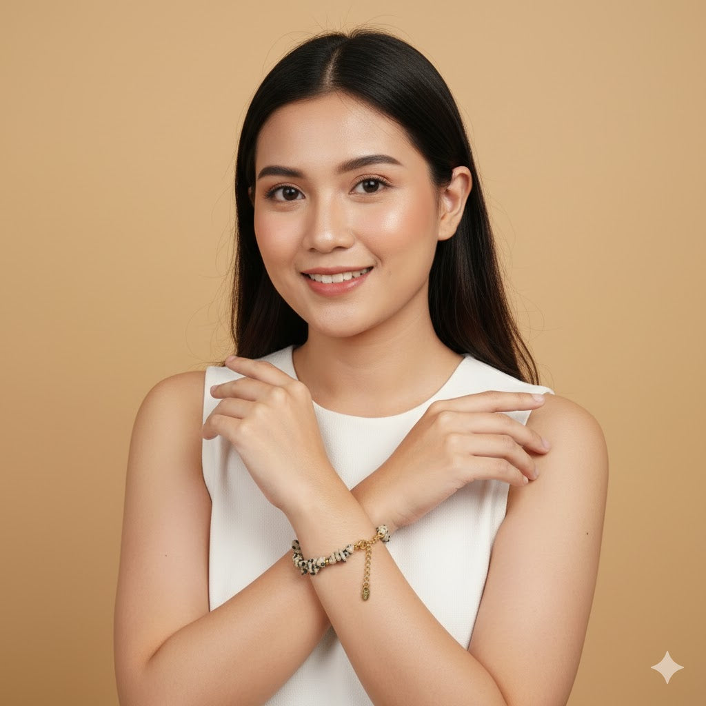 The Bohemian Harmony Dalmatian Jasper Bracelet is a playful yet grounding piece that radiates joy, protection, and a spark of spontaneity. Each Dalmatian Jasper stone is handpicked for its creamy beige tone speckled with distinctive black spots, echoing nature’s wild charm and whimsical flair. Paired with rustic brass accents, this bracelet brings a lighthearted boho vibe with a touch of earthy wisdom. The Bohemian Harmony Dalmatian Jasper Bracelet is perfect for those who embrace their individuality and walk through life with curiosity and confidence. A reminder to stay rooted while keeping your spirit free—it’s fun, fearless, and full of character.