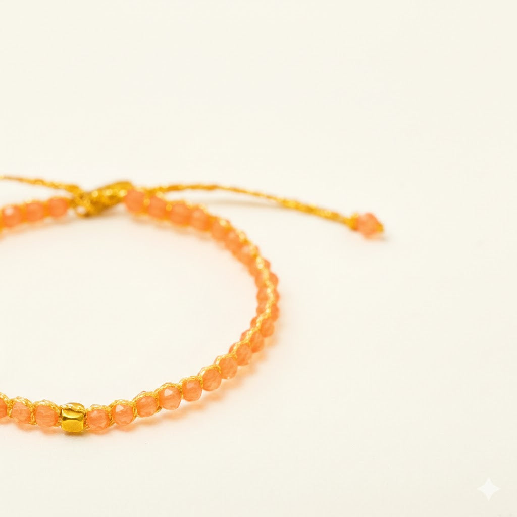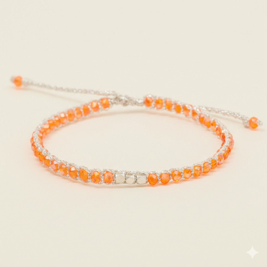Unveiling our exquisite Crystalegance Orange Bracelet, a stunning display of artistry that perfectly marries luxury with a warm, homey touch. The bracelet is adorned with premium, vibrant orange crystals that shimmer with an undeniable glow, reflecting not just light, but your distinct personality. Each crystal is meticulously cut to catch the eye and stimulate the senses, emulating the radiant hues of a sunset, infusing each day with a sense of warmth and positivity. The crystals are beautifully intertwined with high-quality, intertwining gold and silver yarn, imparting a timeless allure. The gold yarn imbues a sense of opulence and majesty, while the silver yarn adds a dash of elegance and serenity to the design. Furthermore, this beautiful piece pays homage to the comforts of home, bringing with it a sense of tranquility and nostalgia. As such, our Crystalegance Orange Bracelet is not just a piece of jewelry, it is an extension of your home, carrying its warm essence wherever you go. This bracelet, indeed, is an embodiment of chic sophistication, meeting domestic warmth, creating a captivating, unique charm that's truly hard to resist.