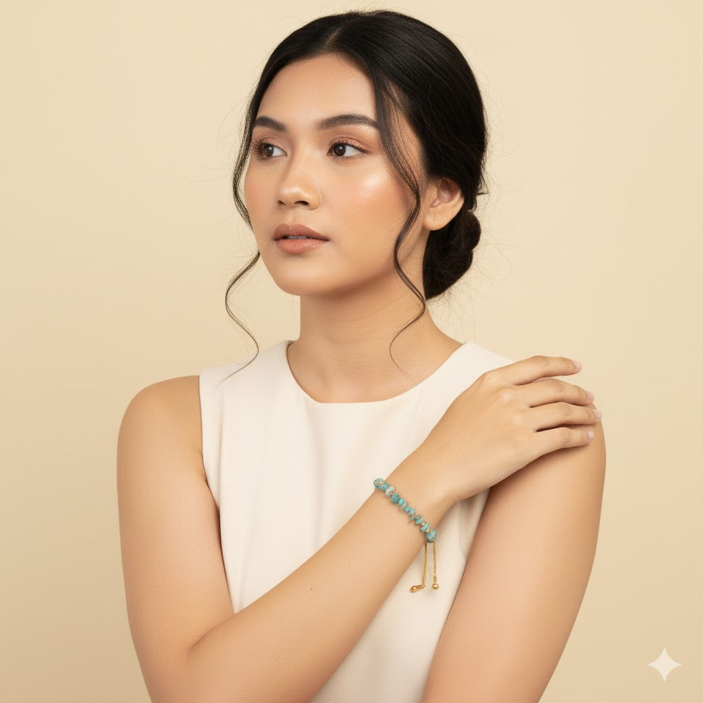 The Vivian Apatite Bracelet is a captivating and elegant accessory that showcases the mesmerizing beauty of Apatite gemstones. Known for their stunning blue-green hues and clarity, each Apatite stone is carefully selected and paired with high-quality stainless steel, ensuring durability and a unique aesthetic appeal. Perfect for those who appreciate the calming energy and striking appearance of Apatite, this bracelet makes a versatile and sophisticated addition to any jewelry collection, adding a touch of vibrant elegance to any outfit.