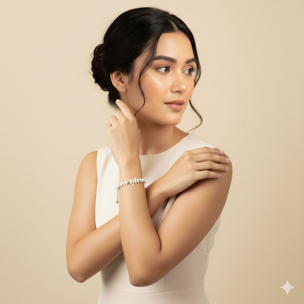 The Vivian Howlite Bracelet is a serene and stylish accessory that showcases the calming beauty of Howlite gemstones. Known for its creamy white color with gray veining, Howlite is believed to promote relaxation and stress relief. Each stone is carefully selected and paired with high-quality stainless steel, ensuring durability and a refined aesthetic. Ideal for those who appreciate the soothing energy and minimalist charm of Howlite, this bracelet makes a versatile and sophisticated addition to any jewelry collection, adding a touch of tranquility and elegance to any outfit.
