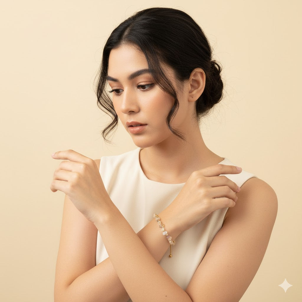 The Vivian Mix Rutilated Quartz Bracelet is an exquisite and dynamic accessory that combines elegance with a touch of uniqueness. This bracelet features a stunning blend of Rutilated Quartz gemstones, showcasing a variety of needle-like inclusions in golden, black, and other hues. Each gemstone is meticulously chosen and paired with high-quality stainless steel, creating a striking and durable piece. The Vivian Mix Rutilated Quartz Bracelet is perfect for those who appreciate the diverse beauty and powerful energy of Rutilated Quartz, making it a versatile addition to any jewelry collection, adding a touch of intrigue and sophistication to any outfit.