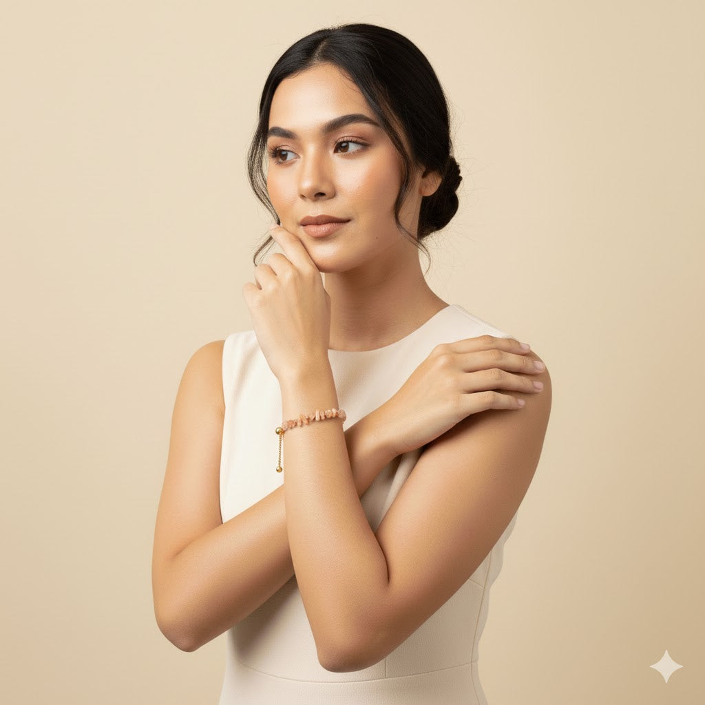 The Vivian Sunstone Bracelet is a radiant and elegant accessory that celebrates the warm and enchanting beauty of Sunstone gemstones. Known for their shimmering reflections and uplifting properties, each Sunstone is carefully chosen and set with premium stainless steel, ensuring a unique and durable piece. The Vivian Sunstone Bracelet is perfect for those who admire the vibrant energy and sparkling allure of Sunstone, making it a versatile and sophisticated addition to any jewelry collection, adding a touch of warmth and brilliance to any outfit.