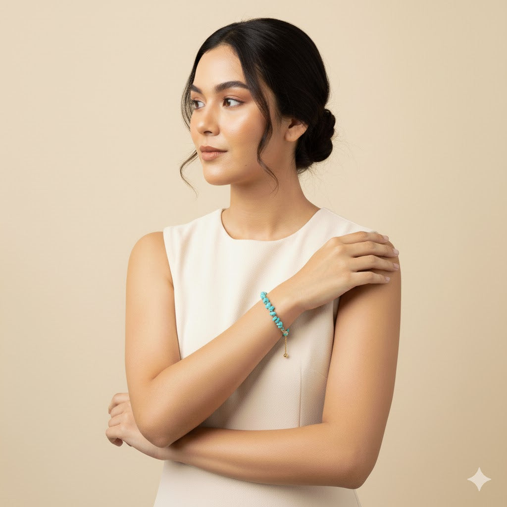 The Vivian Turquoise Bracelet is a vibrant and elegant accessory that celebrates the striking beauty of Turquoise gemstones. Known for its vivid blue-green hues reminiscent of clear skies, Turquoise is believed to bring protection and positivity. Each stone is meticulously chosen and paired with high-quality stainless steel, ensuring durability and a timeless appeal. Ideal for those who appreciate the energetic and healing properties of Turquoise, this bracelet makes a versatile and sophisticated addition to any jewelry collection, adding a touch of boldness and serenity to any outfit.